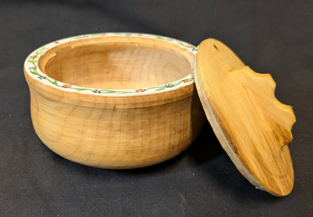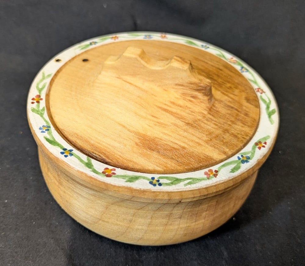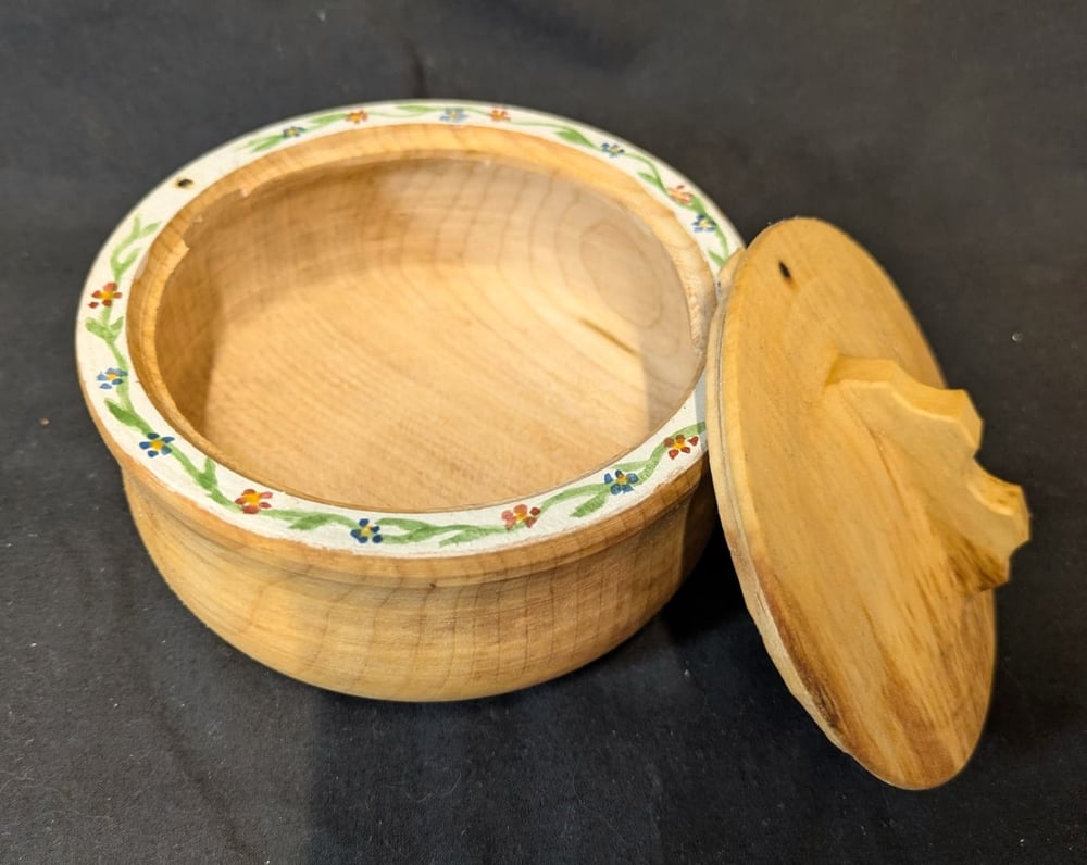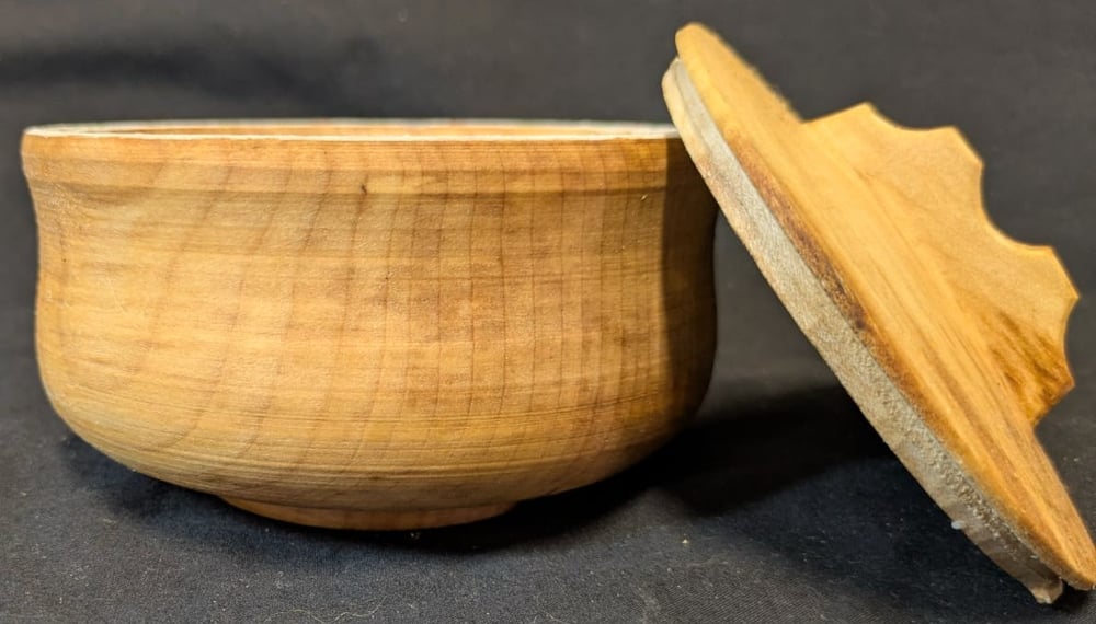 Locking lid boxes are complex to make requiring some specialist tools and plenty of experience and fine control to get things right. To open the lid simply turn the lid until the two dots line up then lift the lid. To lock it tuck the tab at the opposite end to the dot under the rim, drop the lid into place and turn gently clockwise until it stops turning.